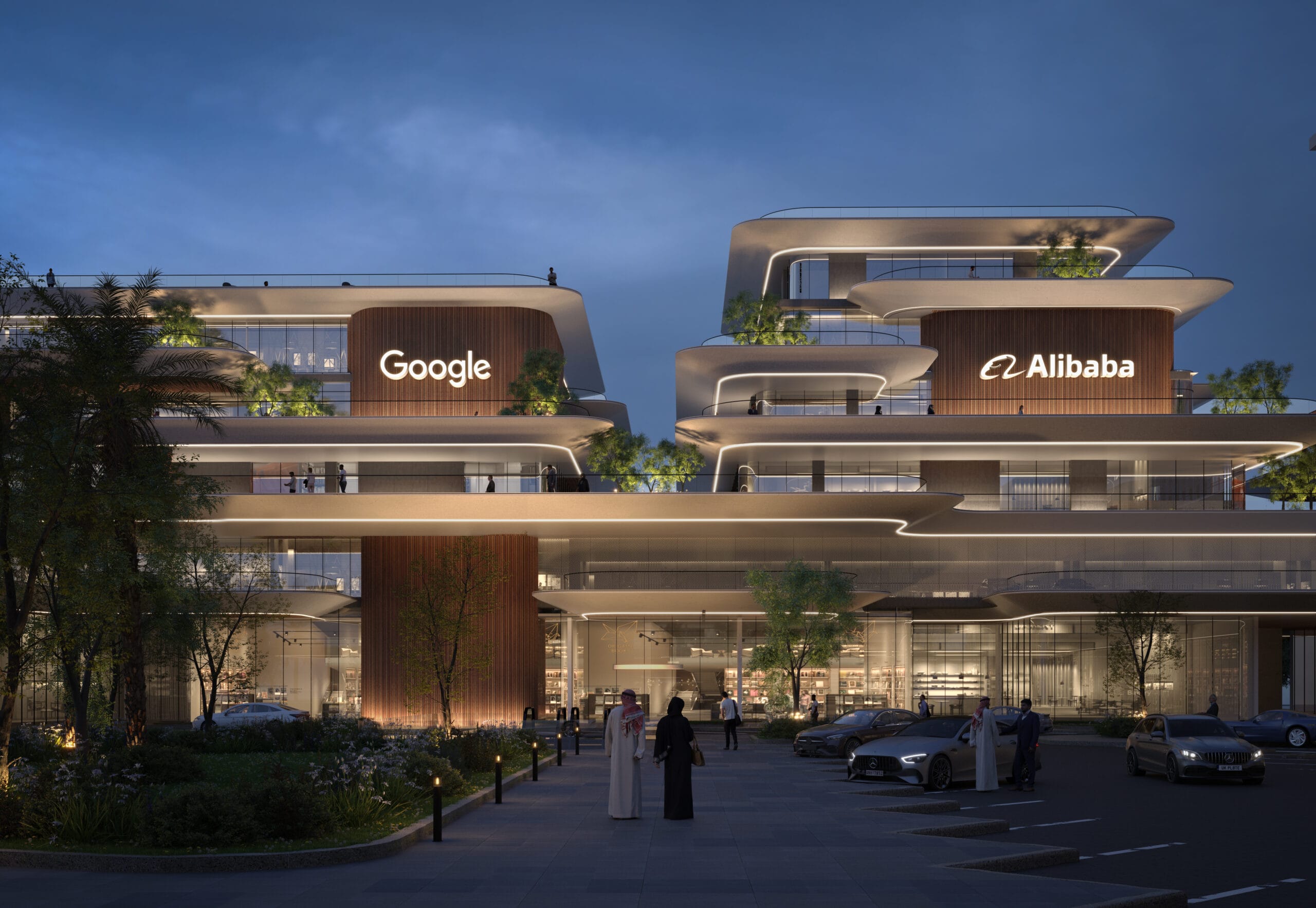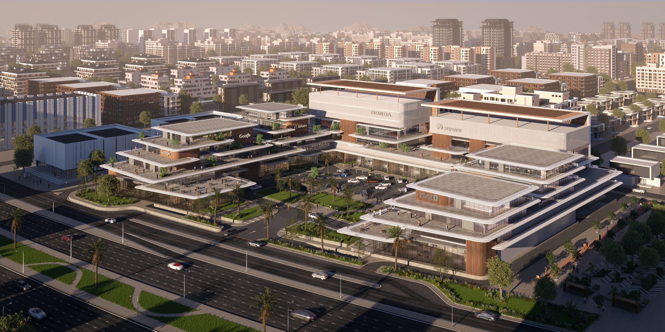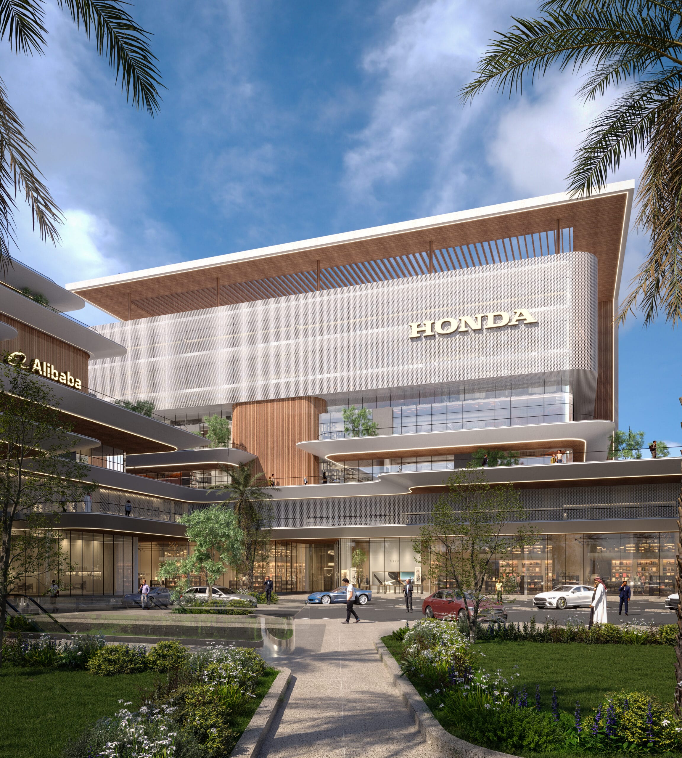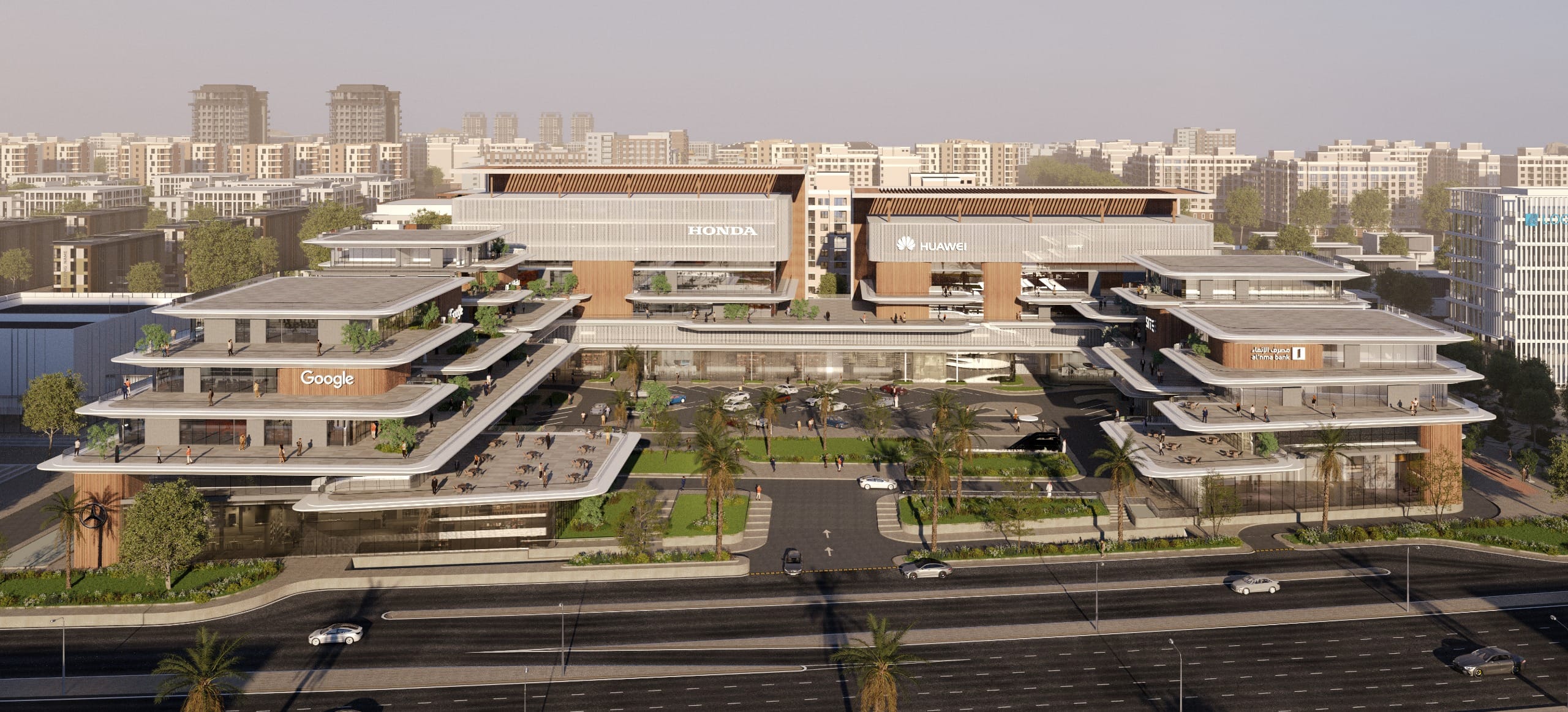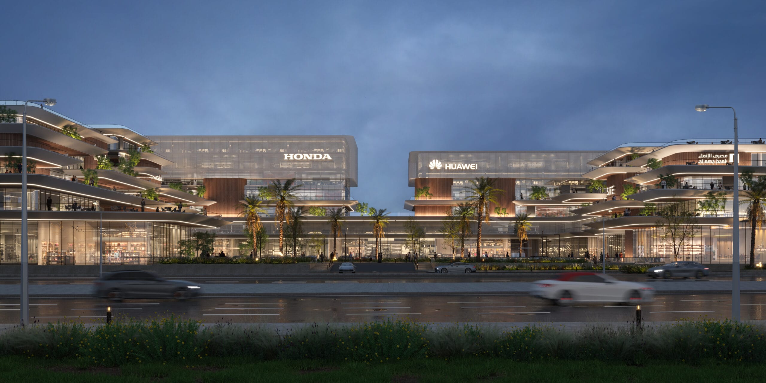 مشروع تجاري إداري بتصميم مستقبلي خارج عن المألوف حيث يتكون معارض تجارية وفيلات مكتبية على السطح مع كتلة أمامية بارزة على طريق الملك عبدالعزيز بطول يتجاوز 130متر ومحمولة على مجموعات من الأعمدة تحاكي في مظهرها أشجار الزان.